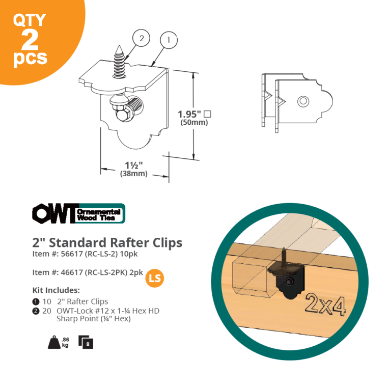 2, 2" Rafter Clips, 4 OWT-Lock #12 x 1-¼ Hex HD Sharp Point (¼" Hex)
